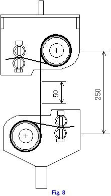 | (1) Specimen holders are mounted on tensile strength test machine with spacing of 250±2.5mm. (2) Approx. 2m of glass cord is taken from bobbin without breakage of a specimen. (3) A specimen is wound on an upper holder in 3 times clockwise without touch of cords. (4) An end of specimen described in (3) is put in a space between two pipes of upper stopper and wound on lower pipe in 3 times counterclockwise without touch of cords. (5) An end of specimen is cramped between two pipes by screwing. (6) Similarly, the other end of specimen wound on lower holder in 3 times clockwise without touch of cords. (7) An end of specimen described in (6) is put in a space between two pipes of lower stopper and wound on lower pipe in 3 times clockwise without touch of cords. (8) An end of specimen is cramped between two pipes by screwing. (9) Ruler is applied to the specimen stretched between up-and-down holders, and two marks are put on it at intervals of 50mm using a white paints pen. |